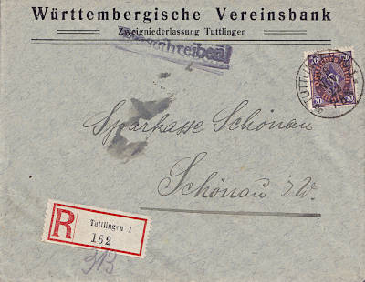Inland cover with registeration (1-20 g) from 28.11.1922 (10. Period) franked with one stamp a 20 Mark (=20 Mark, 12 cover 8 registeration) |