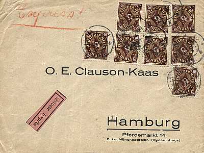 Inlandsbrief mit Eilzustellung (21-100 g) vom 28.06.1923 (13. Periode) frankiert mit 8 Marken a 30 Mark (=240 Mark, 120 Brief 120 Eilzustellung) |