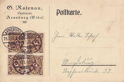 Inlandspostkarte vom 23.07.1923 (14. Periode) frankiert mit 4 Marken a 30 Mark (=120 Mark) |
