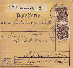Inlandspaketkarte (2 500 g, < 75 km) vom 02.12.1922 (10. Periode) frankiert mit 2 Marken a 30 Mark (=60 Mark) |