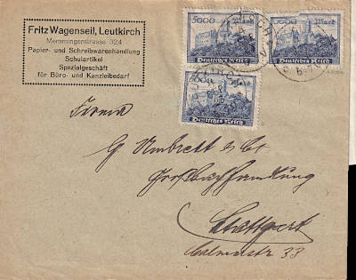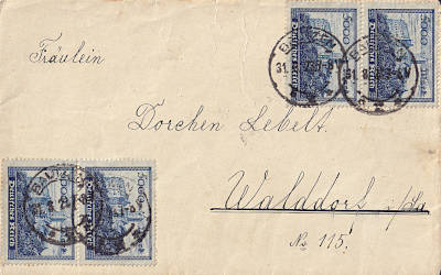 Inland cover (1-20 g) from 31.08.1923 (16. Period) franked with 4 stamps a 5 000 Mark (=20 000 Mark)