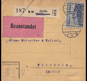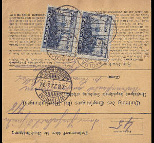 Inland parcel card (10 500 g, 75-375 km) from 04.08.1923 (15. Period) franked with 3 stamps a 5 000 Mark (=15 000 Mark)