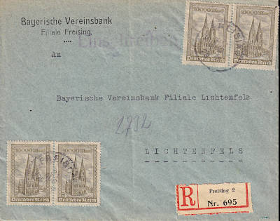 Inland cover with registeration (1-20 g) from 31.08.1923 (16. Period) franked with 4 stamps a 10 000 Mark (=40 000 Mark, 20 000 cover 20 000 registeration) |