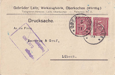 Inland printed matter card from 03.12.1921 (6. Period) franked with 2 stamps a 5 Pfennig (=10 Pfennig)
