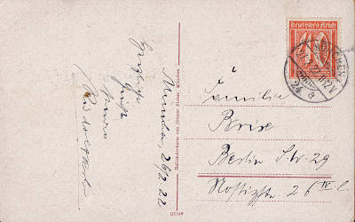 Inlandspostkarte bis 5 Worte vom 27.02.1922 (7. Periode) frankiert mit einer Marke a 40 Pfennig (=40 Pfennig) |