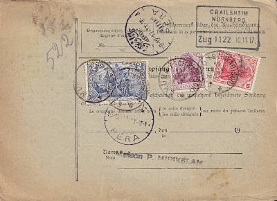 Foreign parcel card with value (400 Mark) (5 000 g) from 10.11.1917 franked with 3 stamps (=2,70 Mark)