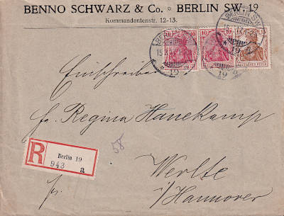 Inland cover with registeration (1-20 g) from 15.03.1917 franked with 3 stamps (=35 Pfennig, 15 cover 20 registeration)