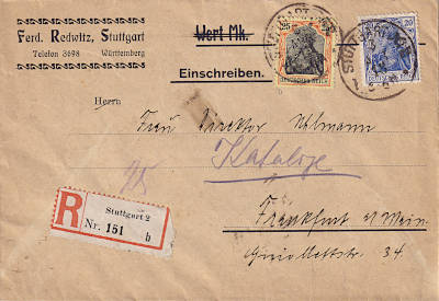 Inland cover with registeration (1-20 g) from 25.10.1916 franked with 2 stamps (=35 Pfennig, 15 cover 20 registeration)