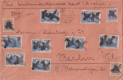 Inlandsbrief mit Wertangabe (100 000 Mark) (240 g, < 75 km) vom 19.11.1918 frankiert mit 11 Marken (=17,20 Mark, 0,25 Brief 16,95 Wert) |