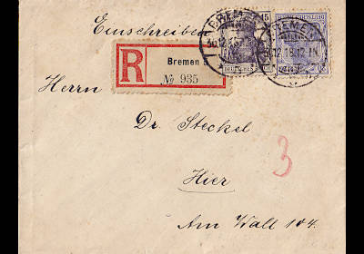 Ortsbrief mit Einschreiben (21-250 g) frankiert mit 2 Marken (=35 Pfennig, 15 Brief 20 Einschreiben) |