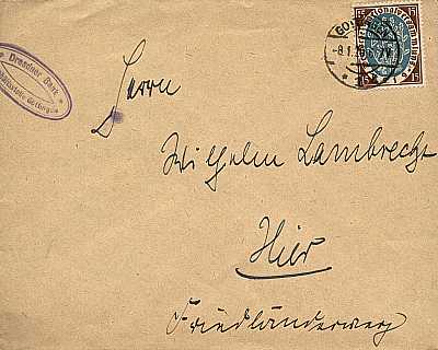 Ortsbrief (1-20 g) vom 08.01.1920 frankiert mit einer Marke a 15 Pfennig (=15 Pfennig)