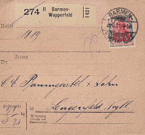 Inlandspaketkarte (2 500 g, < 75 km) vom 13.09.1921 frankiert mit 4 Marken a 75 Pfennig (=3 Mark) |