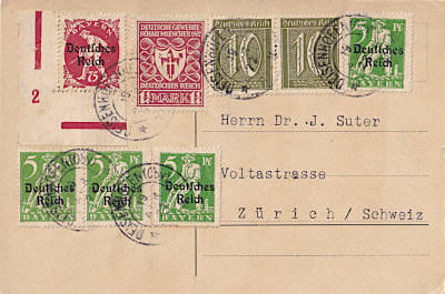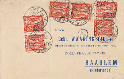 Foreign postcard from 21.02.1922 franked with 6 stamps a 40 Pfennig (=2,40 Mark) |