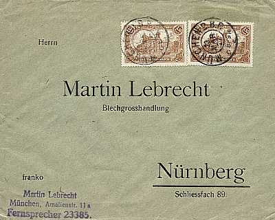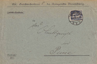 Inland cover (1-20 g) from 24.04.1922 franked with 2 stamps a 1 Mark (=2 Mark) |