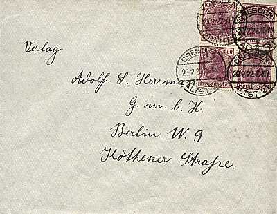 Inland cover (21-100 g) from 23.03.1922 franked with 2 stamps a 1,50 Mark (=3 Mark) |