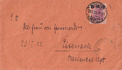 Inland cover (21-100 g) from 20.01.1922 franked with one stamp a 3 Mark on 1¼ Mark (=3 Mark) |