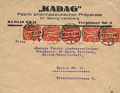 Inland cover (21-100 g) from 05.04.1922 franked with 5 stamps a 60 Pfennig (=3 Mark) |