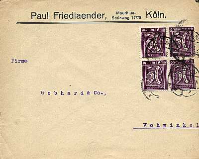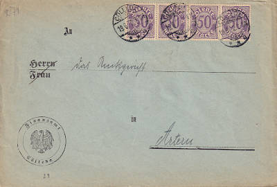 Inland cover (1-20 g) from 20.02.1922 franked with 4 stamps a 50 Pfennig (=2 Mark) |