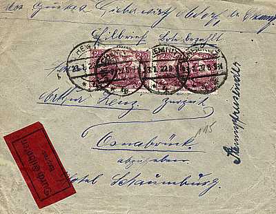Inland cover with special delivery (1-20 g) from 23.01.1922 franked with 2 stamps a 2,50 Mark (=5 Mark, 2 cover 3 special delivery) |