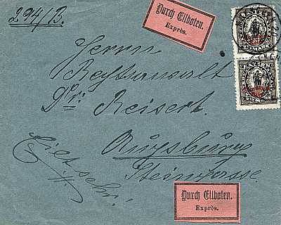 Inland cover with special delivery (1-20 g) from 22.04.1922 franked with 2 stamps a 2½ Mark (=5 Mark, 2 cover 3 special delivery) |