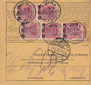 Inland parcel card (6 000 g, > 75 km) from 31.05.1922 franked with 6 stamps a 3 Mark (=18 Mark) |