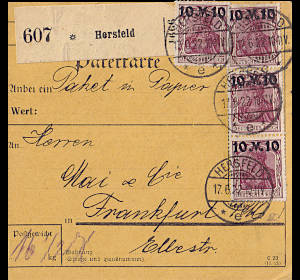 Inland parcel card (16 500 g, > 75 km) from 17.06.1922 franked with 4 stamps a 10 Mark on 75 Pfennig (=40 Mark) |