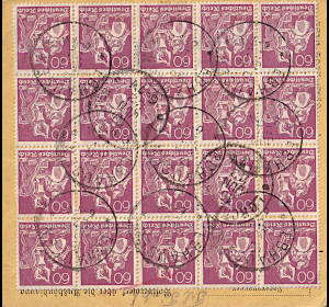 Inland parcel card (7 500 g, < 75 km) from 15.01.1922 franked with 20 stamps a 60 Pfennig (=12 Mark) |