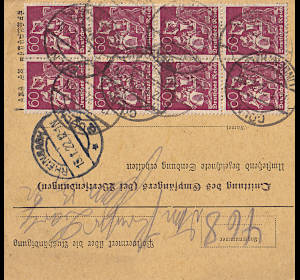 Inland parcel card (3 500 g, < 75 km) from 12.01.1922 franked with 10 stamps a 60 Pfennig (=6 Mark) |