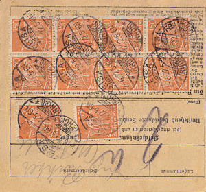 Inland parcel card (9 500 g, > 75 km) from 02.06.1922 franked with 12 stamps a 1,50 Mark (=18 Mark) |