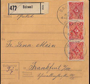 Inland parcel card (4 500 g, > 75 km) from 09.02.1922 franked with 3 stamps a 3 Mark (=9 Mark) |