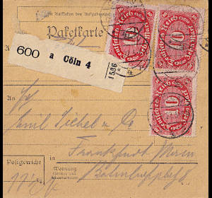 Inland parcel card (11 500 g, > 75 km) from 19.06.1922 franked with 3 stamps a 10 Mark (=30 Mark) |