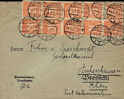 Inlandsbrief (1-20 g) vom 04.09.1922 frankiert mit 10 Marken a 30 Pfennig (=3 Mark) |