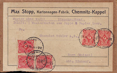 Foreign trade sample (401-450 g) from 11.10.1922 franked with 5 stamps (=36 Mark)