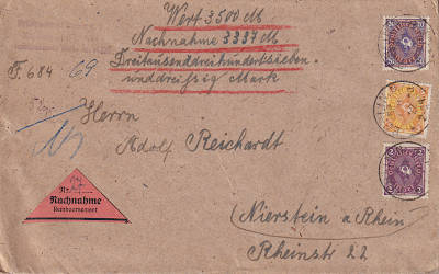 Inlandsbrief mit Wertangabe (3 500 Mark) und Nachnahme (52 g) vom 07.11.1922 frankiert mit 3 Marken (=27 Mark, 8 Brief 4 Einschreiben 12 Wert 3 Nachnahme) |