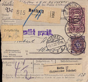 Auslandspaketkarte (4 500 g, > 75 km) vom 15.11.1922 frankiert mit 2 Marken (=120 Mark)