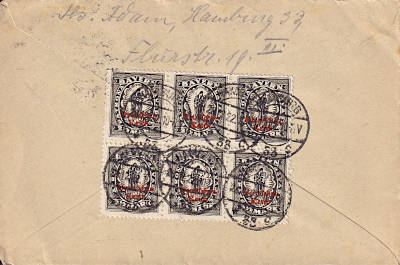Inlandsbrief (1-20 g) vom 10.01.1923 frankiert mit 5 Marken a 5 Mark (=25 Mark)
