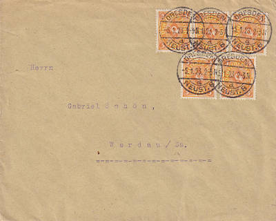Inlandsbrief (1-20 g) vom 05.01.1923 frankiert mit 5 Marken a 5 Mark (=25 Mark)