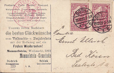 Inland printed matter (1-25 g) from 23.12.1922 franked with 2 stamps a 2,50 Mark (=5 Mark)