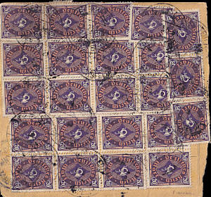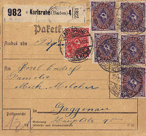 Inlandspaketkarte (12 000 g, > 75 km) vom 09.01.1923 frankiert mit 37 Marken a 20 Mark (=740 Mark) |