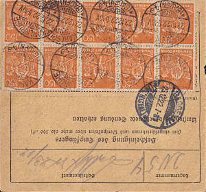 Inlandspaketkarte (1 500 g, < 75 km) vom 22.12.1922 frankiert mit 16 Marken (=125 Mark) |