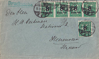 Foreign printed matter (1-50 g) from 19.09.1923 franked with 5 stamps a 8 000 Mark on 30 Pfennig (=40 000 Mark) |
