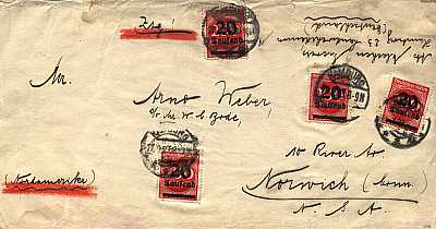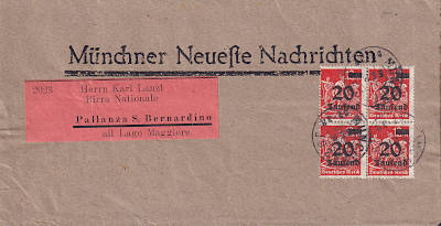 Foreign printed matter (1-50 g) from 18.09.1923 franked with 4 stamps (=40 000 Mark) |