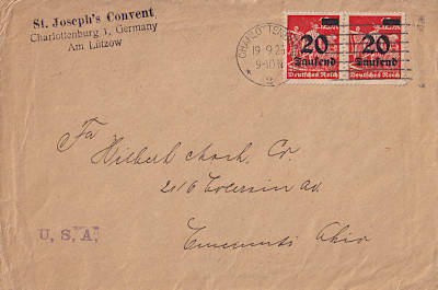 Foreign printed matter (1-50 g) from 19.09.1923 franked with 2 stamps a 20 000 Mark on 12 Mark (=40 000 Mark) |