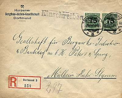 Inlandsbrief mit Einschreiben (1-20 g) vom 19.09.1923 frankiert mit 2 Marken a 75 000 Mark auf 400 Mark (=150 000 Mark, 75 000 Brief 75 000 Einschreiben) |