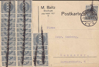 Inlandspostkarte vom 07.09.1923 frankiert mit 10 Marken a 3 000 Mark (=30 000 Mark) |