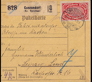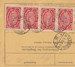 Inlandspaketkarte (4 500 g, > 75 kg) vom 15.09.1923 frankiert mit 5 Marken a 100 000 Mark (=500 000 Mark)