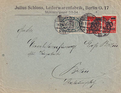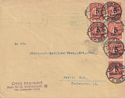 Local cover (1-20 g) from 17.09.1923 franked with 6 stamps a 5 000 Mark on 5 Mark (=30 000 Mark) |