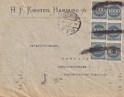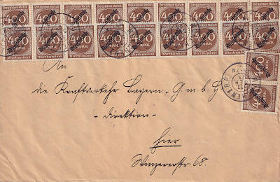 Local cover (1-20 g) from 11.09.1923 franked with 75 stamps a 400 Mark (=30 000 Mark) |
