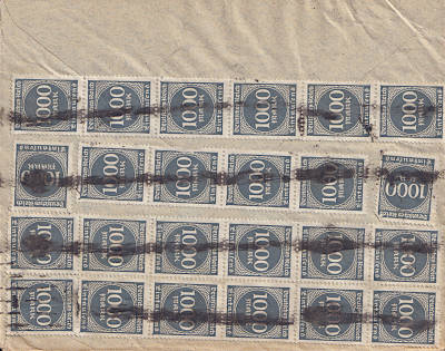 Local cover (251-500 g) from 06.09.1923 franked with 30 stamps a 3 000 Mark (=90 000 Mark) |