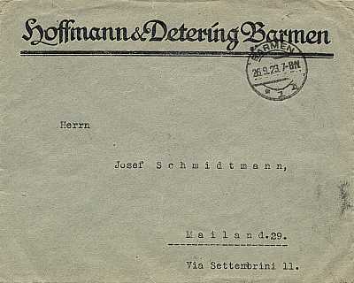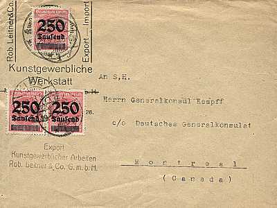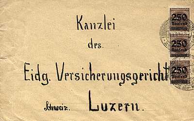Foreign cover (1-20 g) from 29.09.1923 franked with 3 stamps a 250 000 Mark on 500 Mark (=750 000 Mark) |